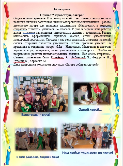 Главная Воспитательная работа Организация оздоровления Дневной воспитательный-оздоровительный лагерь "Непоседы" Дневной воспитательный-оздоровительный лагерь "Непоседы" 09 февраля 2026 Дневной воспитательный-оздоровительный лагерь "Непоседы" План мероприятий